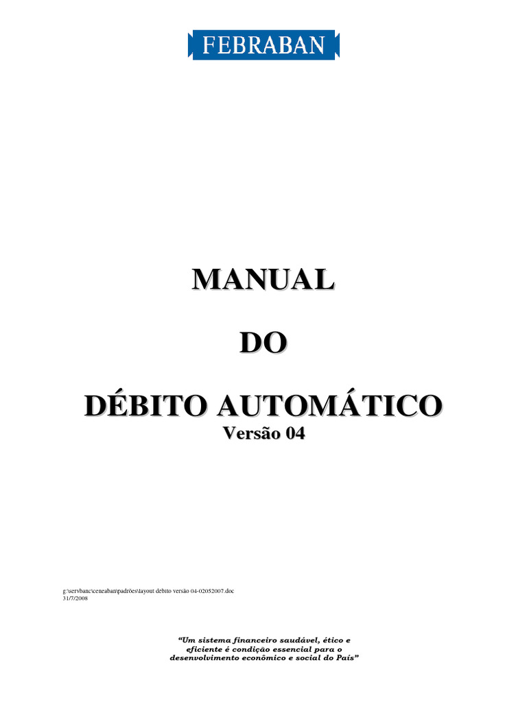 As especificações técnicas contidas neste manual contemplam o Padrão FEBRABAN de Débito Automático, versão 04,