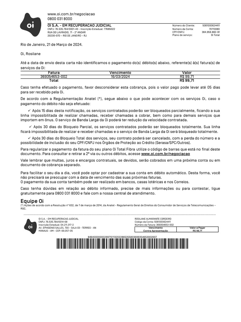 OI S.A. - EM RECUPERACAO JUDICIAL ROSILANE ALMARANTE CORDEIRO