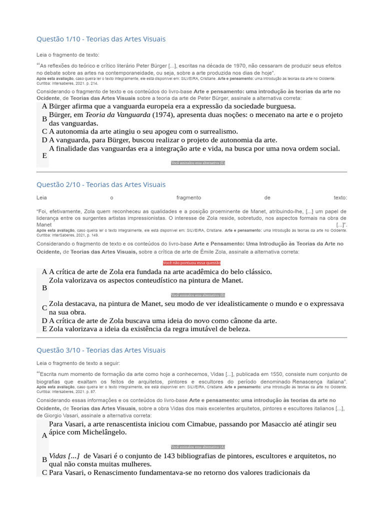Após esta avaliação, caso queira ler o texto integralmente, ele está disponível em: SILVEIRA, Cristiane. Arte e pensamento: uma introdução às teorias da arte no Ocidente.