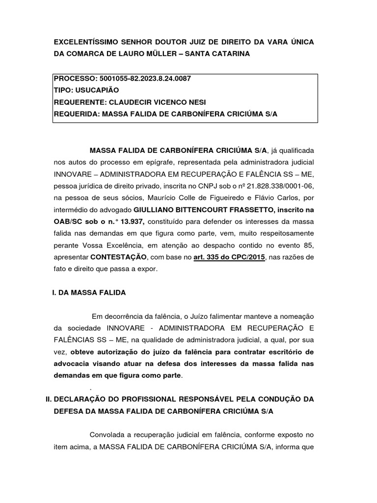 DEFESA DA MASSA FALIDA DE CARBONÍFERA CRICIÚMA S/A