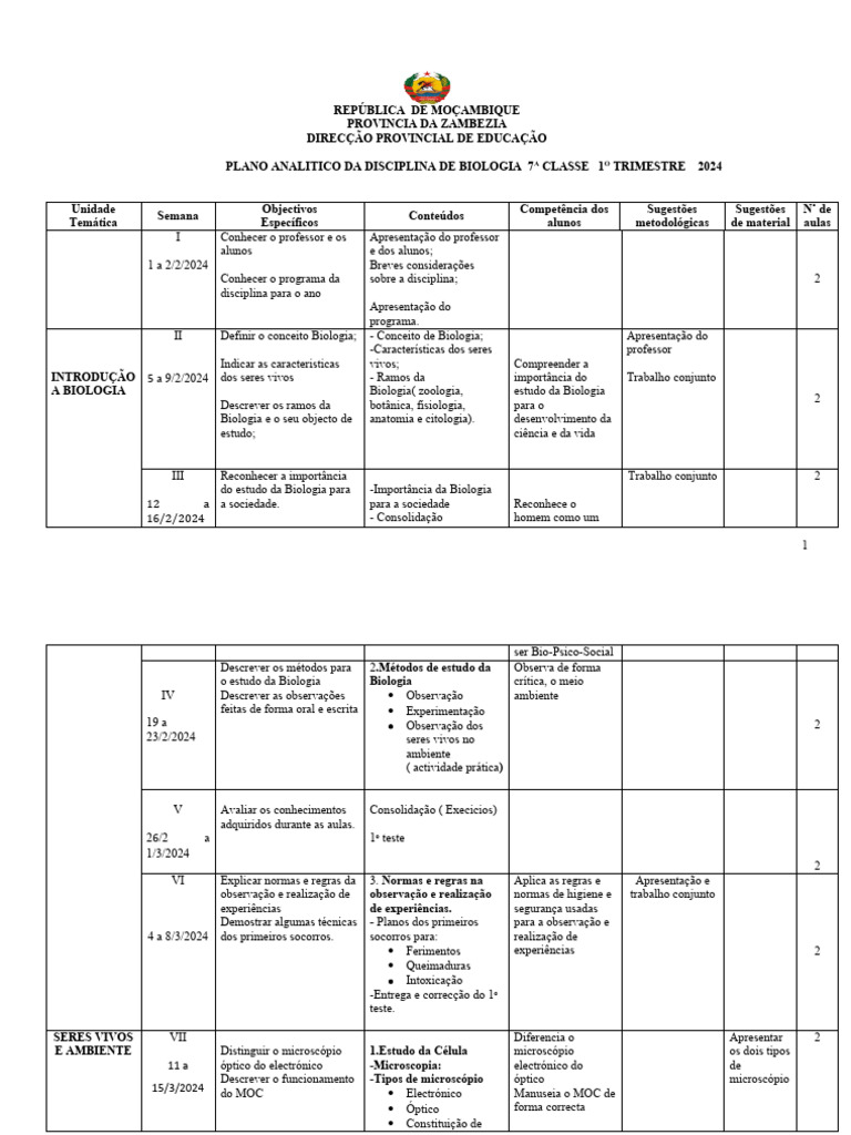 PLANO ANALITICO DA DISCIPLINA DE BIOLOGIA 7A CLASSE 1O TRIMESTRE 2024
