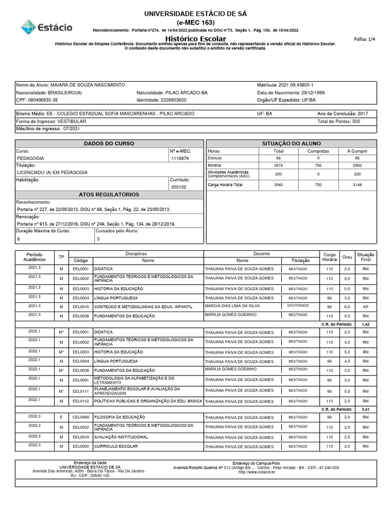 UNIVERSIDADE ESTÁCIO DE SÁ Avenida Rodolfo Queiroz Nº 313 (Antigo 69) ,, - Centro - Pilao Arcado - BA - CEP.: 47.240-000
