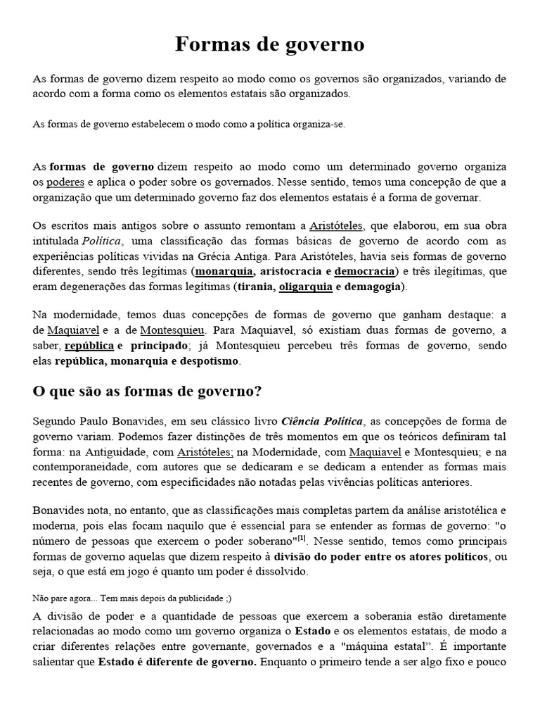 Esse é o caso para se falar sobre formas de governo para a Ciência Política. Essa denominação