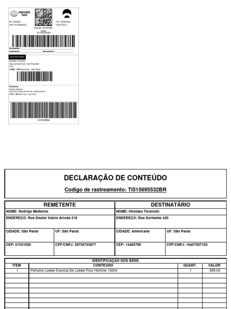 CEP: 01551020 CPF/CNPJ: 29730723877 CEP: 13465790 CPF/CNPJ: 10457587105