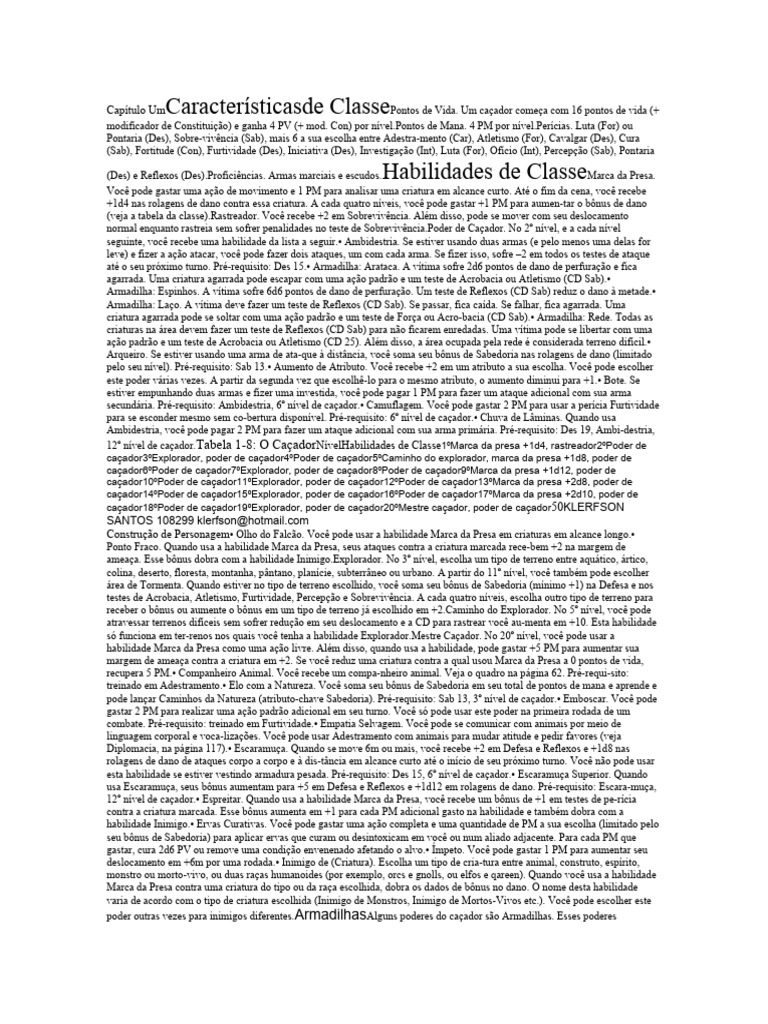 modificador de Constituição) e ganha 4 PV (+ mod. Con) por ní[Link] de Mana. 4 PM por ní[Link]ícias. Luta (For) ou