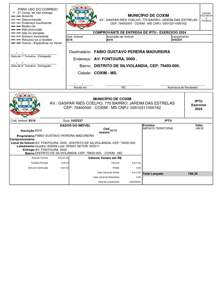 Não foi atendido COMPROVANTE DE ENTREGA DE IPTU - EXERCÍCIO 2024