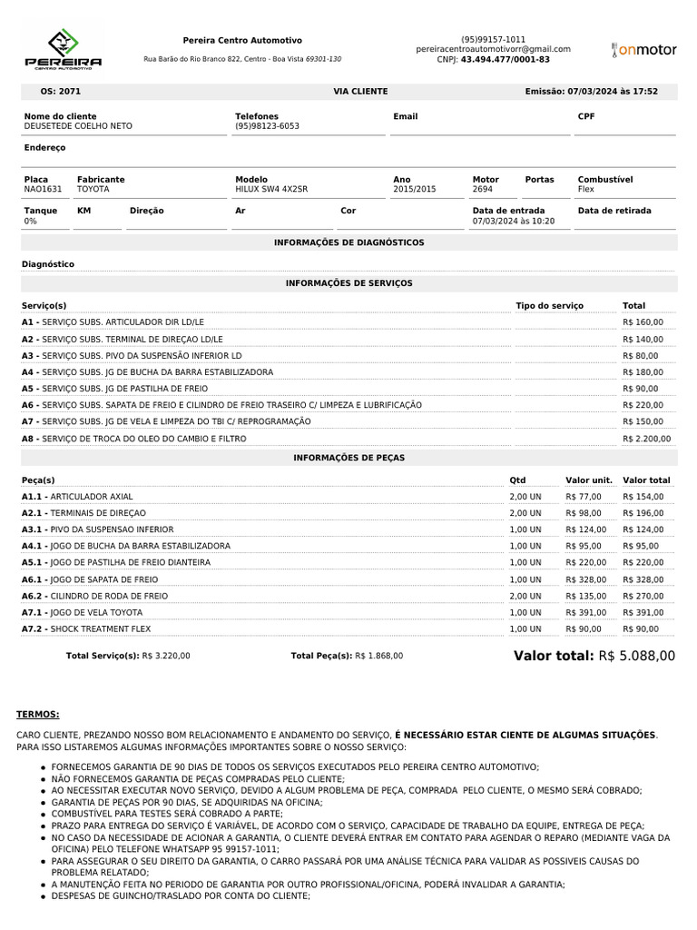 Total Serviço(s): R$ 3.220,00 Total Peça(s): R$ 1.868,00 Valor total: R$ 5.088,00