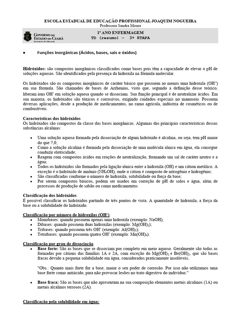 Funções Inorgânicas (Ácidos, bases, sais e óxidos)