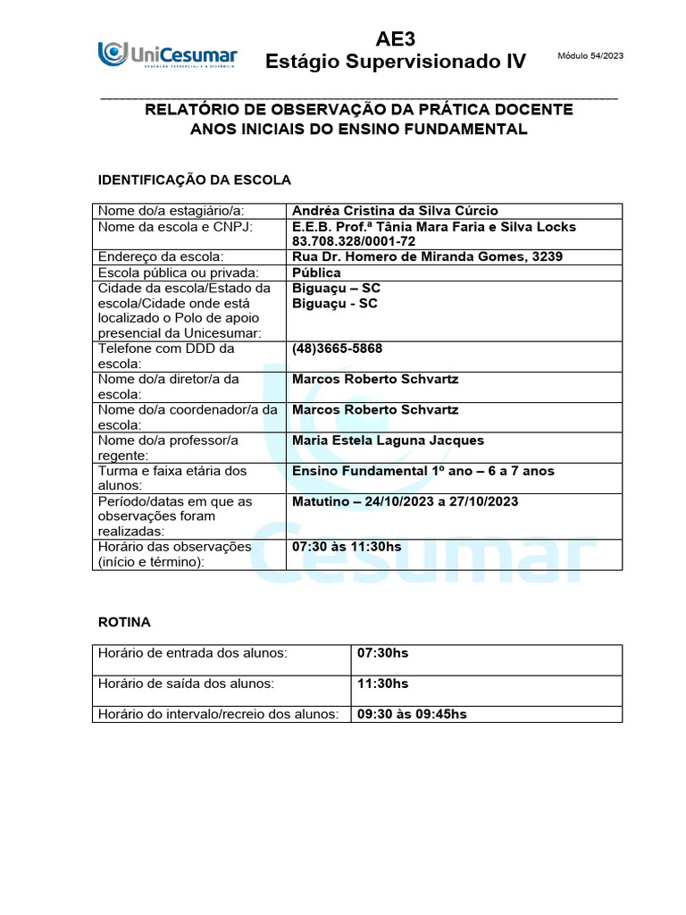 Nome do/a estagiário/a: Andréa Cristina da Silva Cúrcio