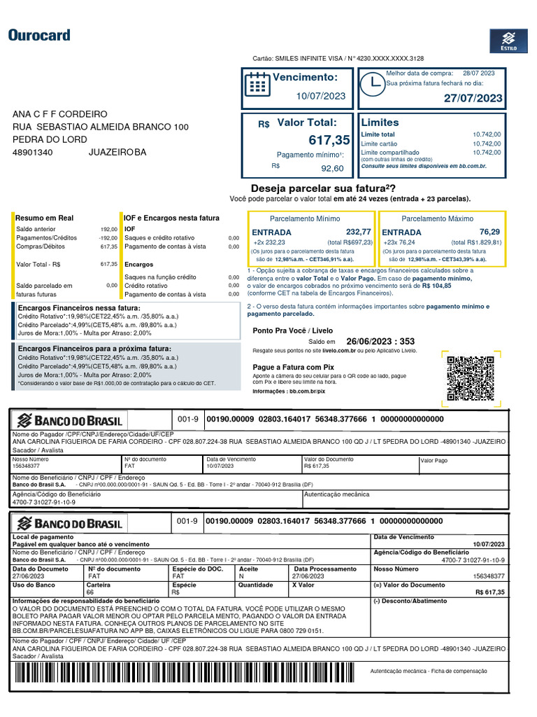 48901340 JUAZEIROBA Pagamento mínimo¹: Limite compartilhado 10.742,00
