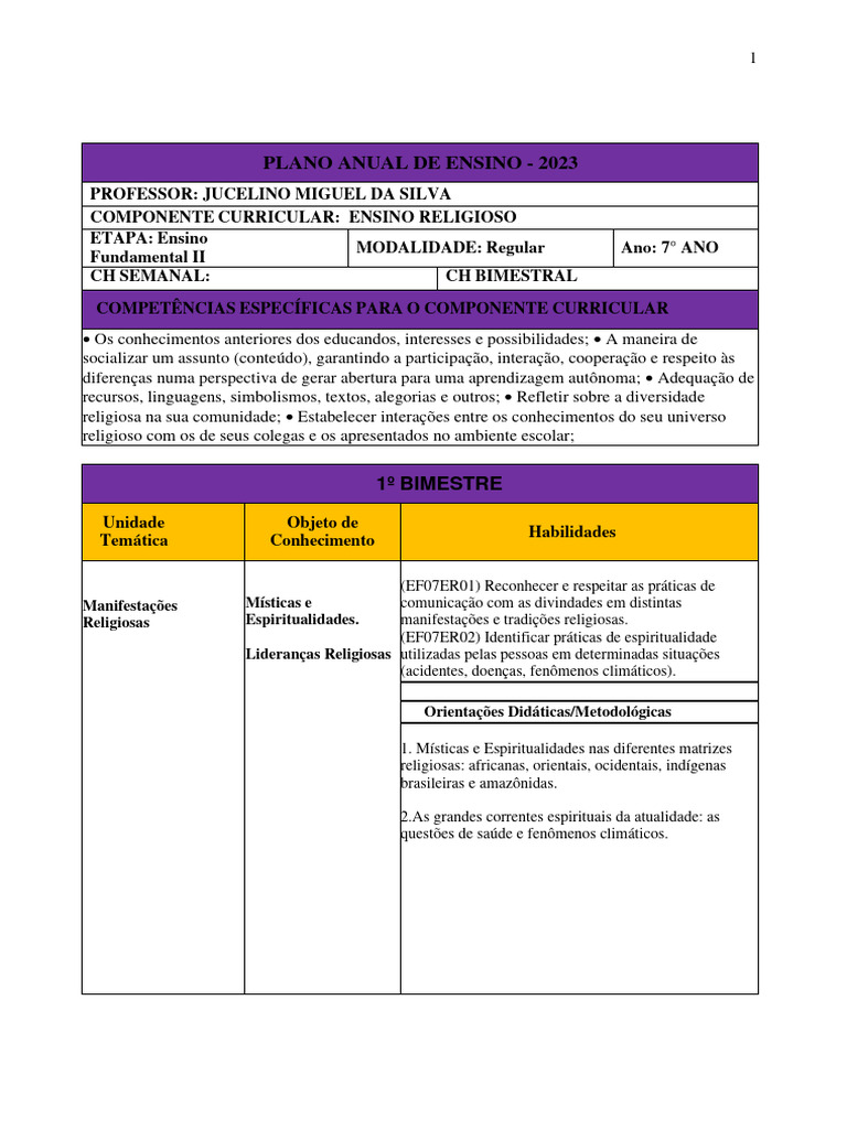 COMPONENTE CURRICULAR: ENSINO RELIGIOSO