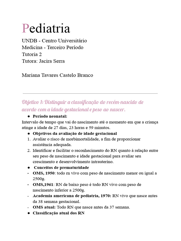 Objetivo 1: Distinguir a classificação do recém-nascido de