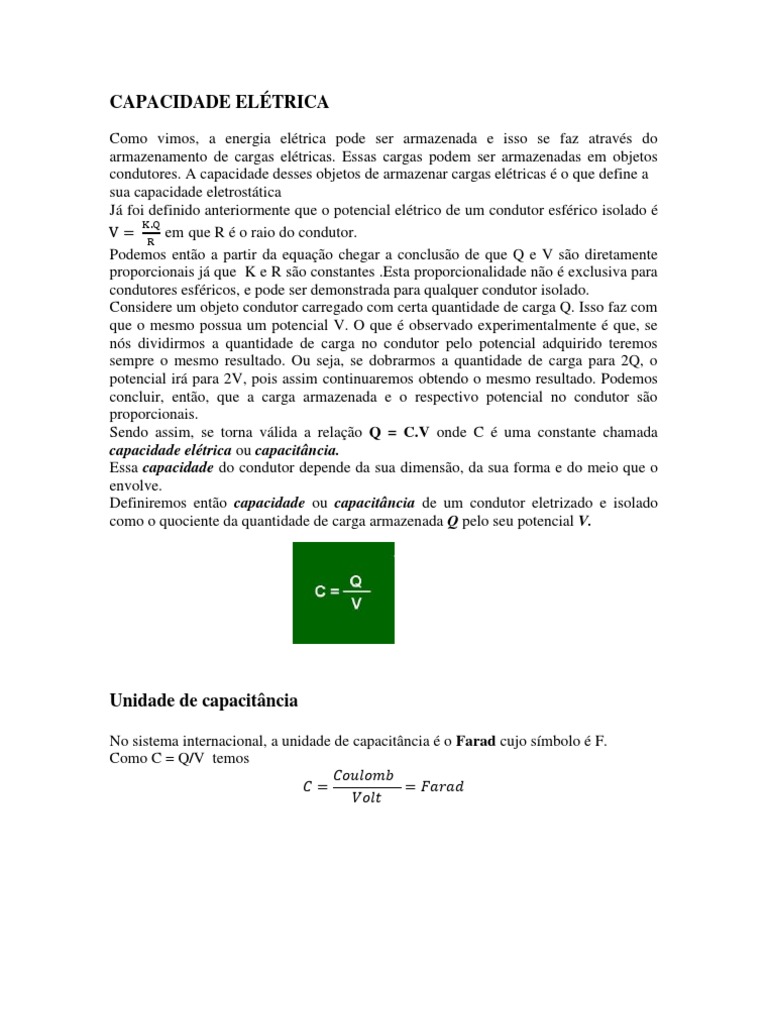 Como vimos, a energia eltrica pode ser armazenada e isso se faz atravs do armazenamento de cargas eltricas. Essas cargas podem ser armazenadas em objetos condutores. A capacidade desses objetos de armazenar cargas eltricas o que define a sua capacidade eletrosttica J foi definido anteriormente que o potencial eltrico de um condutor esfrico isolado em que R o raio do condutor. Podemos ento a partir da equao chegar a concluso de que Q e V so diretamente proporcionais j que K e R so constantes .Esta proporcionalidade no exclusiva para condutores esfricos, e pode ser demonstrada para qualquer condutor isolado. Considere um objeto condutor carregado com certa quantidade de carga Q. Isso faz com que o mesmo possua um potencial V. O que observado experimentalmente que, se ns dividirmos a quantidade de carga no condutor pelo potencial adquirido teremos sempre o mesmo resultado. Ou seja, se dobrarmos a quantidade de carga para 2Q, o potencial ir para 2V, pois assim continuaremos obtendo o mesmo resultado. Podemos concluir, ento, que a carga armazenada e o respectivo potencial no condutor so proporcionais. Sendo assim, se torna vlida a relao Q = C.V onde C uma constante chamada capacidade eltrica ou capacitncia. Essa capacidade do condutor depende da sua dimenso, da sua forma e do meio que o envolve. Definiremos ento capacidade ou capacitncia de um condutor eletrizado e isolado como o quociente da quantidade de carga armazenada Q pelo seu potencial V.