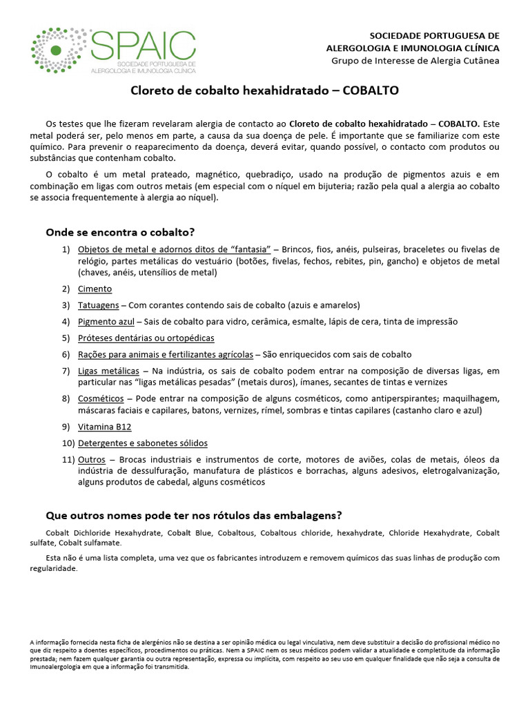 Os testes que lhe fizeram revelaram alergia de contacto ao Cloreto de cobalto hexahidratado – COBALTO. Este