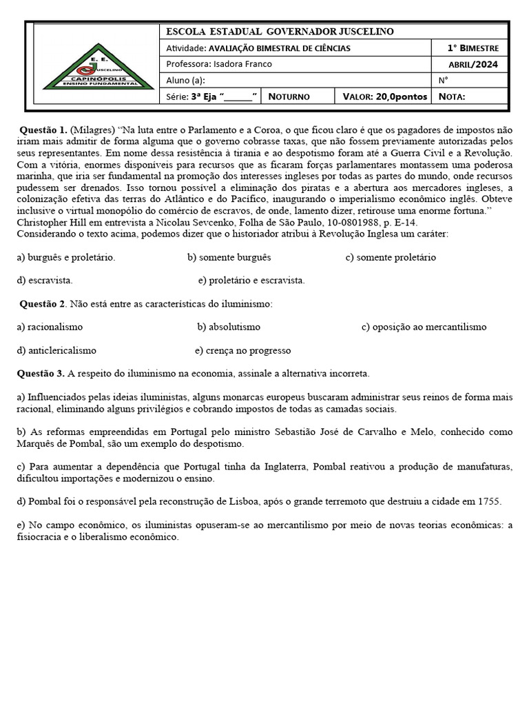 Questão 8. Acontecimento que se passou no Brasil e que foi diretamente influenciado pelos ideais iluministas: