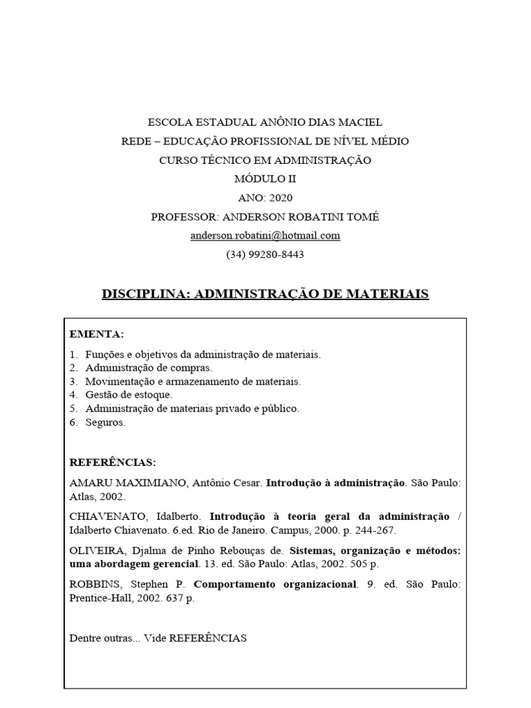 DISCIPLINA: ADMINISTRAÇÃO DE MATERIAIS