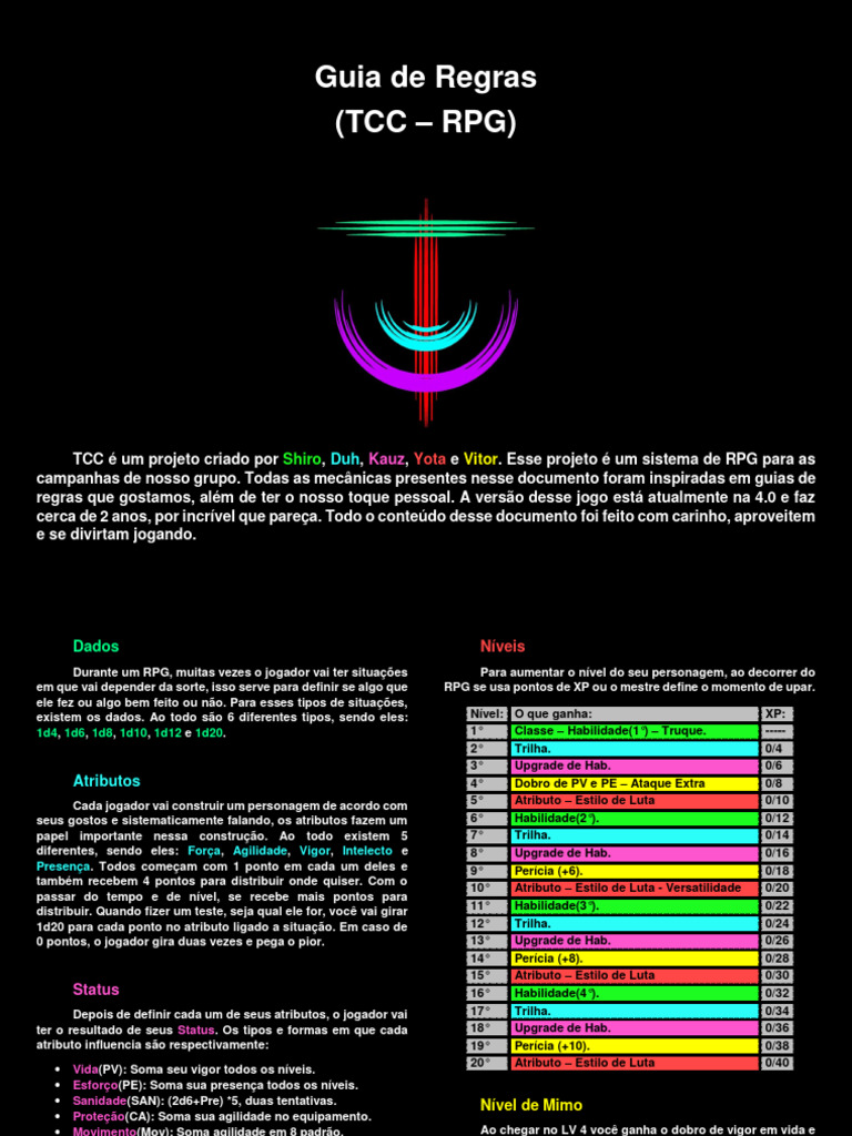 TCC é um projeto criado por Shiro, Duh, Kauz, Yota e Vitor. Esse projeto é um sistema de RPG para as