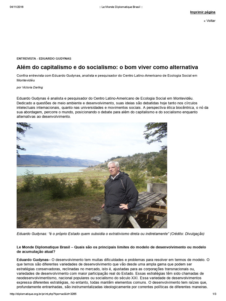 Palavras chave: Eduardo Gudynas, América Latina, Bom viver, ecologia, meio ambiente, extrativismo