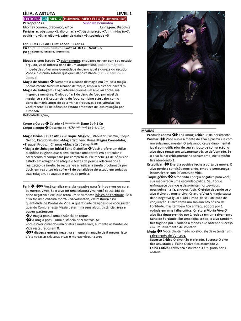 Magia Divina, CD 17 Atk +7 •Truque Mágico; Estabilizar, Pasmar, Toque Produzir Chama 1d4+mod; Critico +1d4 persistente
