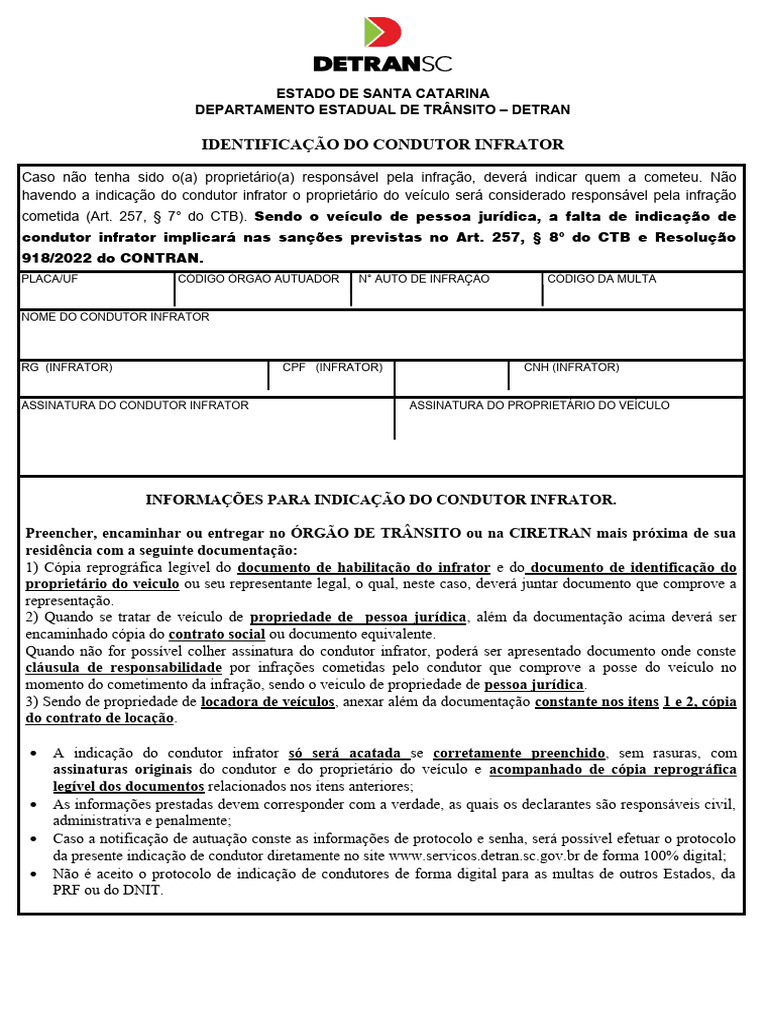 A indicação do condutor infrator só será acatada se corretamente preenchido, sem rasuras, com