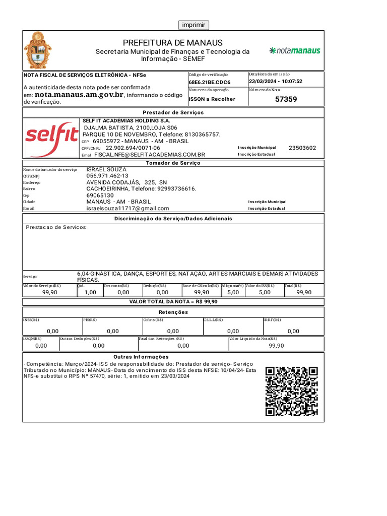 Tributado no Munic ípio: MANAUS - Data do ve nc im e nto do IS S de sta NFS E: 10/04/24- Esta