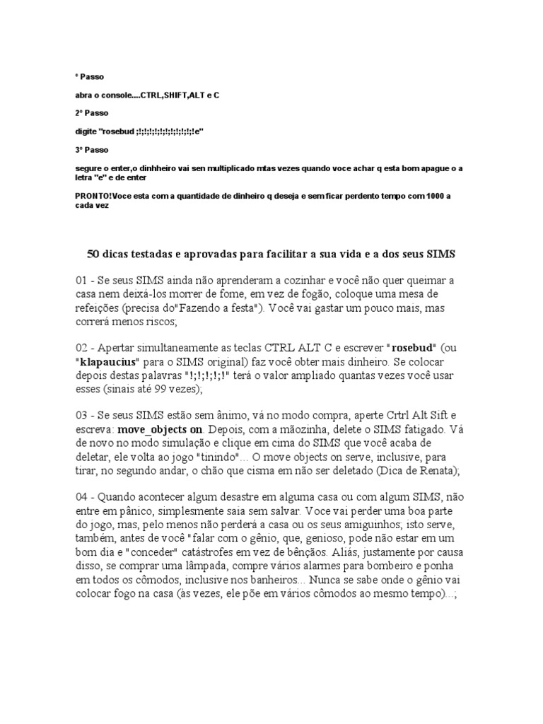 50 dicas testadas e aprovadas para facilitar a sua vida e a dos seus SIMS 01 - Se seus SIMS ainda no aprenderam a cozinhar e voc no quer queimar a casa nem deix-los morrer de fome, em vez de fogo, coloque uma mesa de refeies (precisa do"Fazendo a festa"). Voc vai gastar um pouco mais, mas correr menos riscos; 02 - Apertar simultaneamente as teclas CTRL ALT C e escrever "rosebud" (ou "klapaucius" para o SIMS original) faz voc obter mais dinheiro. Se colocar depois destas palavras "!;!;!;!;!" ter o valor ampliado quantas vezes voc usar esses (sinais at 99 vezes); 03 - Se seus SIMS esto sem nimo, v no modo compra, aperte Crtrl Alt Sift e escreva: move_objects on. Depois, com a mozinha, delete o SIMS fatigado. V de novo no modo simulao e clique em cima do SIMS que voc acaba de deletar, ele volta ao jogo "tinindo"... O move objects on serve, inclusive, para tirar, no segundo andar, o cho que cisma em no ser deletado (Dica de Renata); 04 - Quando acontecer algum desastre em alguma casa ou com algum SIMS, no entre em pnico, simplesmente saia sem salvar. Voce vai perder uma boa parte do jogo, mas, pelo menos no perder a casa ou os seus amiguinhos; isto serve, tambm, antes de voc "falar com o gnio, que, genioso, pode no estar em um bom dia e "conceder" catstrofes em vez de bnos. Alis, justamente por causa disso, se comprar uma lmpada, compre vrios alarmes para bombeiro e ponha em todos os cmodos, inclusive nos banheiros... Nunca se sabe onde o gnio vai colocar fogo na casa (s vezes, ele pe em vrios cmodos ao mesmo tempo)...;