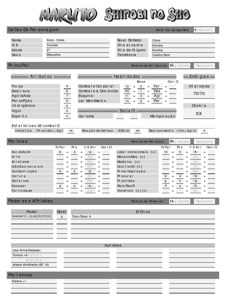InIcIatIva (Prontidão + Agi) 16 Reação de defesa (ESQ +9) 20 Deslocamento (10m + Agi/2) 4