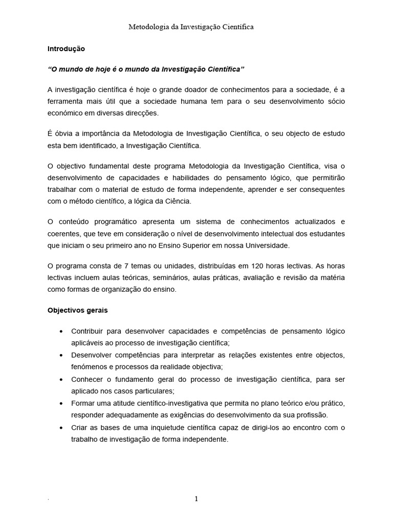O objectivo fundamental deste programa Metodologia da Investigação Científica, visa o