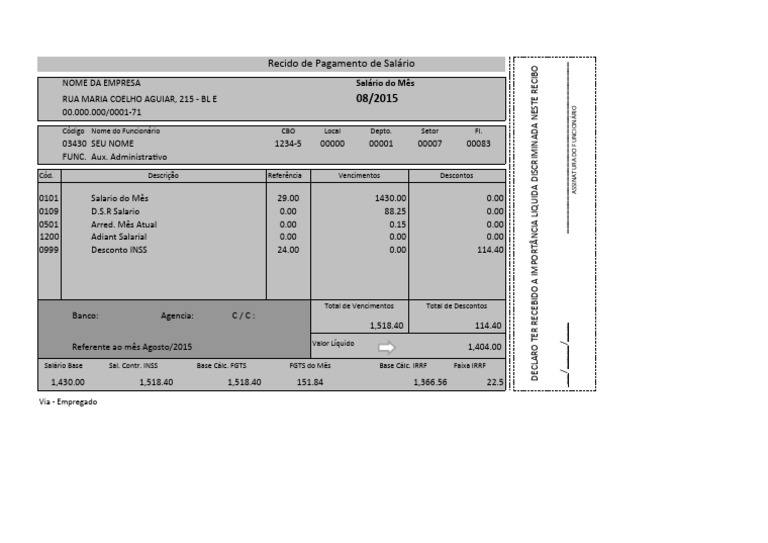 Salário Base Sal. Contr. INSS Base Cálc. FGTS FGTS do Mês Base Cálc. IRRF Faixa IRRF