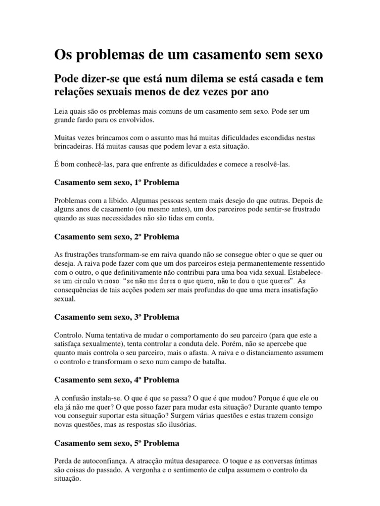 Leia quais so os problemas mais comuns de um casamento sem sexo. Pode ser um grande fardo para os envolvidos. Muitas vezes brincamos com o assunto mas h muitas dificuldades escondidas nestas brincadeiras. H muitas causas que podem levar a esta situao. bom conhec-las, para que enfrente as dificuldades e comece a resolv-las.