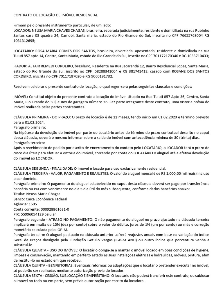 IMÓVEL: Constitui objeto do presente contrato a locação do imóvel situado na Rua Tuiuti 857 Apto 36, Centro, Santa