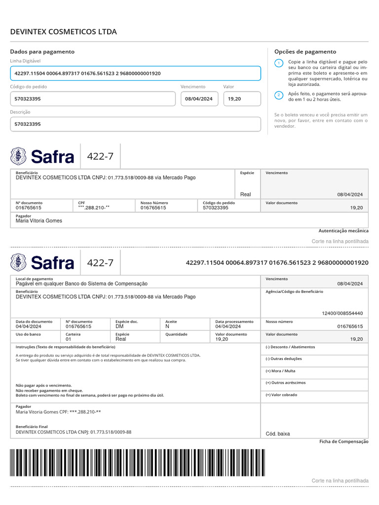 DEVINTEX COSMETICOS LTDA CNPJ: 01.773.518/0009-88 via Mercado Pago
