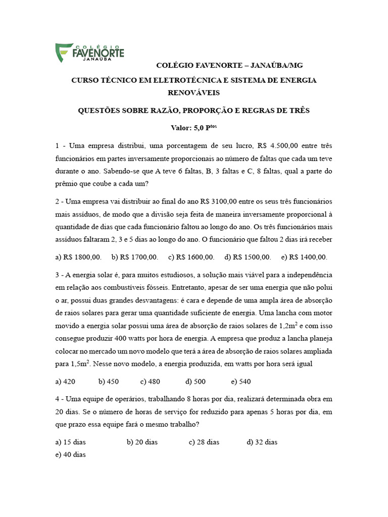 QUESTÕES SOBRE RAZÃO, PROPORÇÃO E REGRAS DE TRÊS
