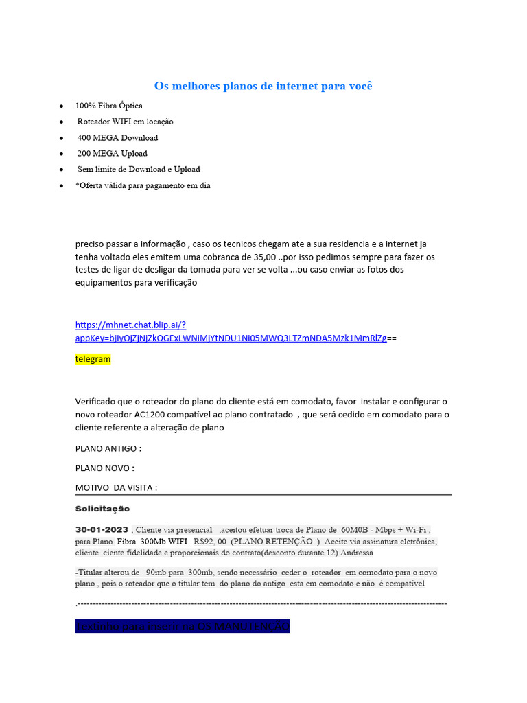 para Plano Fibra 300Mb WIFI R$92, 00 (PLANO RETENÇÃO ) Aceite via assinatura eletrônica,