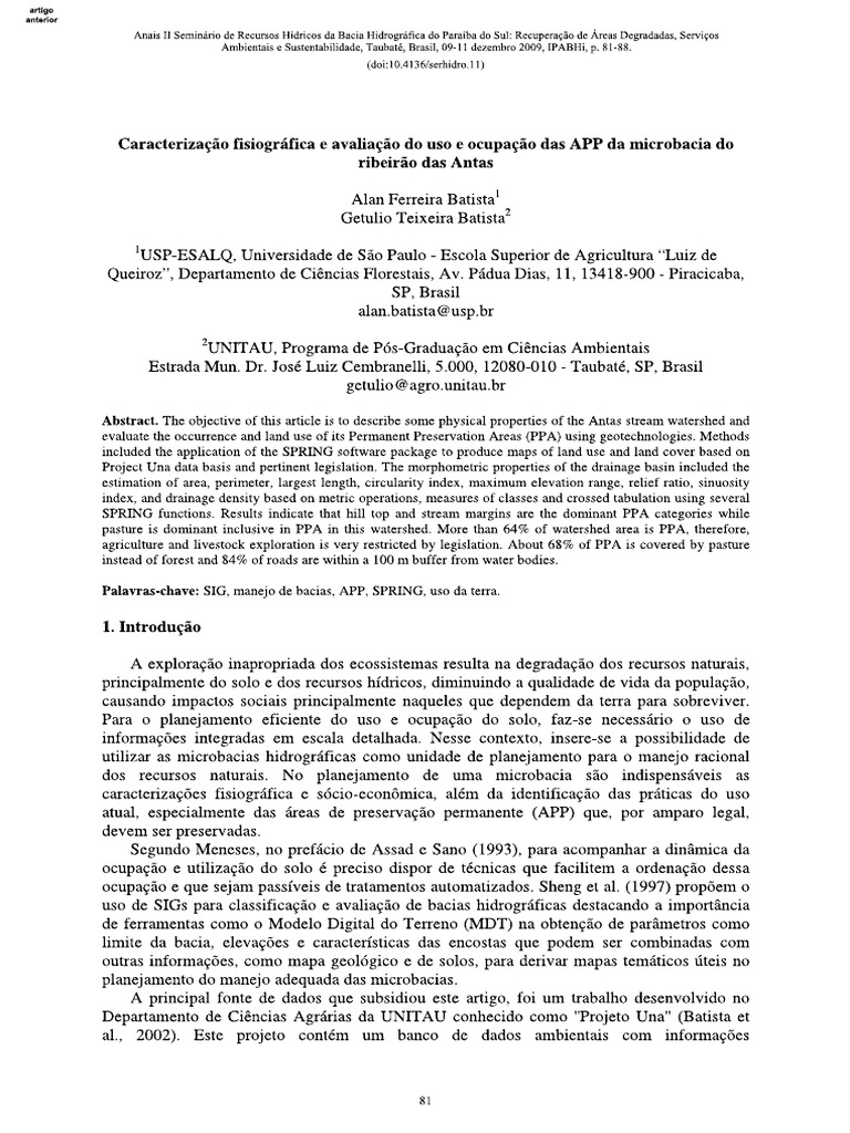 LOPES, R. M: ASSUNCAO, H. F; SCOPEL, I; CABRAL, J.B. P. Caracteristcas fsiograficas e morfomeérica