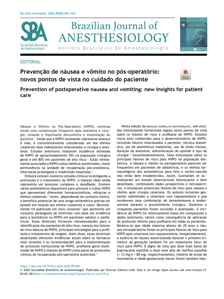 Náusea e Vômito no Pós-Operatório (NVPO) continua Nesta edição da Brazilian Journal of Anesthesiology, seis estu-
