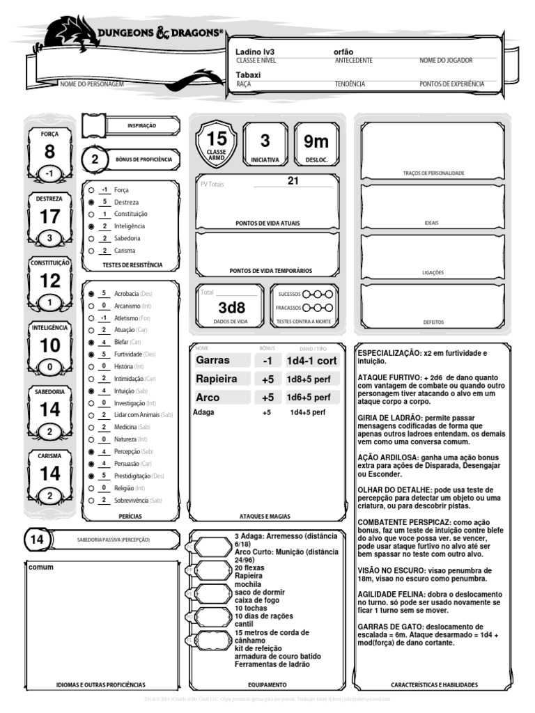 NOME DO PERSONAGEM RAÇA TENDÊNCIA PONTOS DE EXPERIÊNCIA