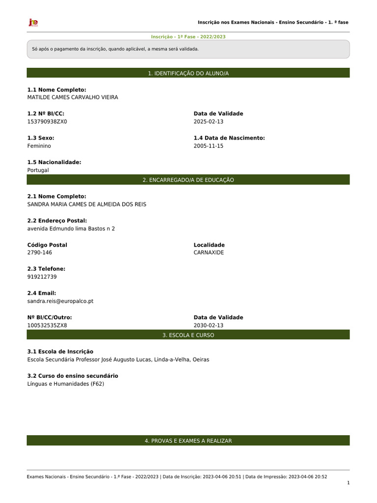 Exames Nacionais - Ensino Secundário - 1.ª Fase - 2022/2023 | Data de Inscrição: 2023-04-06 20:51 | Data de Impressão: 2023-04-06 20:52