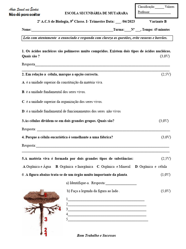 2ª A.C.S de Biologia, 9a Classe. I- Trimestre Data: ___ /04/2023 Variante B
