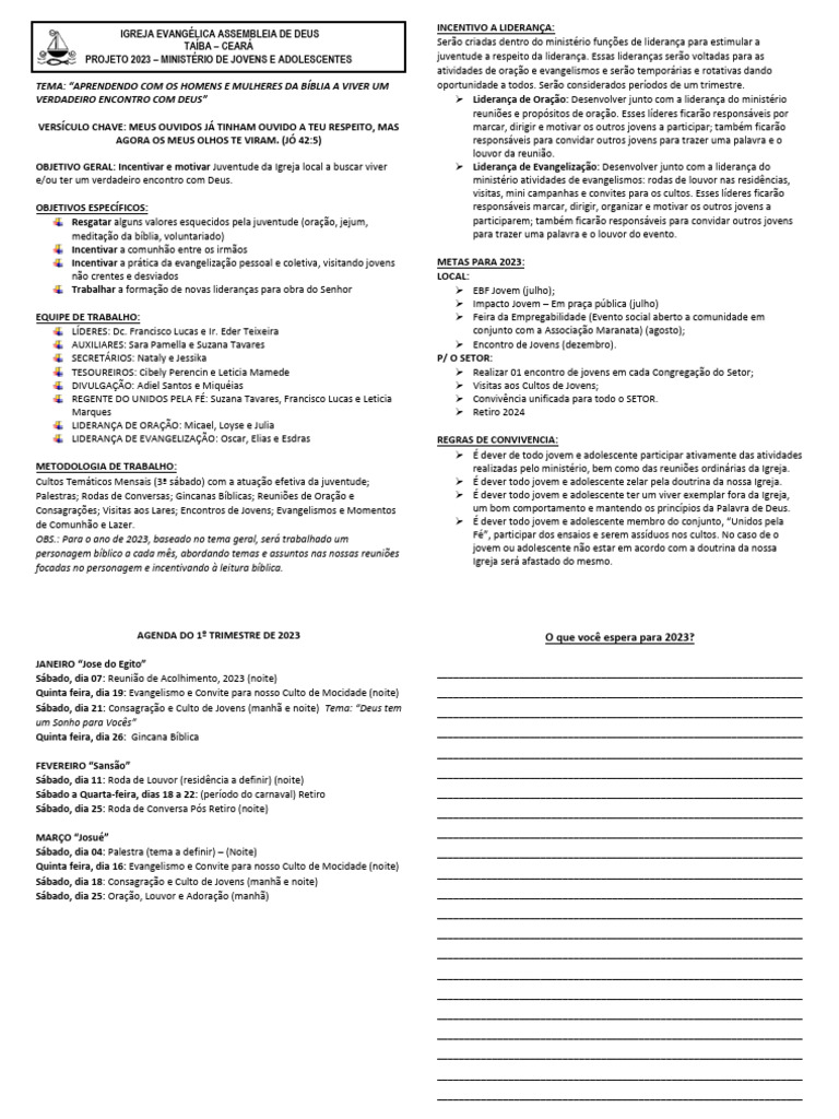 PROJETO 2023 – MINISTÉRIO DE JOVENS E ADOLESCENTES juventude a respeito da liderança. Essas lideranças serão voltadas para as