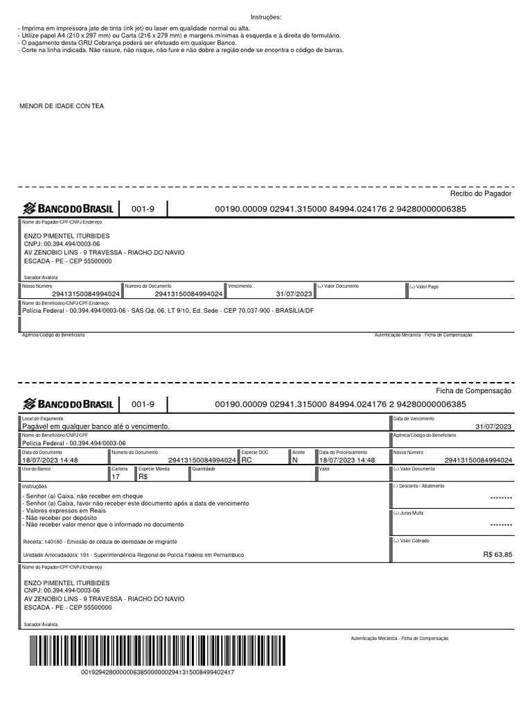 Unidade Arrecadadora: 191 - Superintendência Regional de Polícia Federal em Pernambuco R$ 63,85