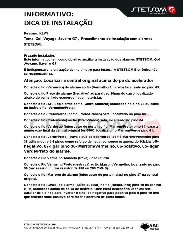 Este informativo tem como objetivo auxiliar a instalação dos alarmes STETSOM, Gol