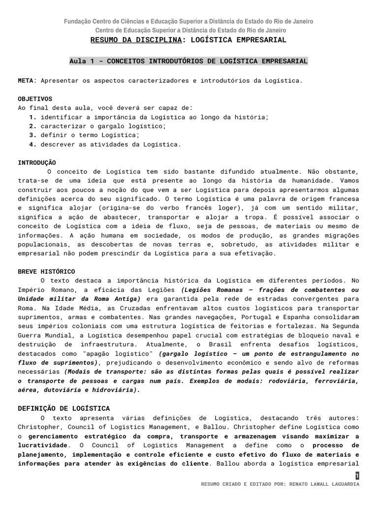 RESUMO DA DISCIPLINA: LOGÍSTICA EMPRESARIAL