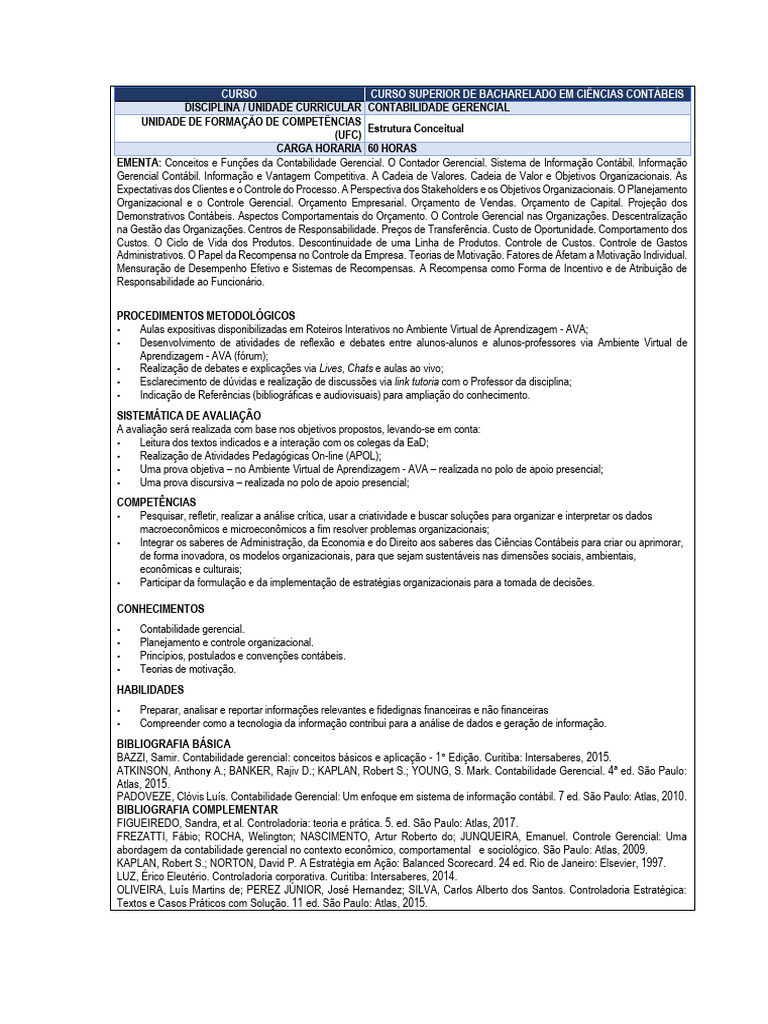 DISCIPLINA / UNIDADE CURRICULAR CONTABILIDADE GERENCIAL