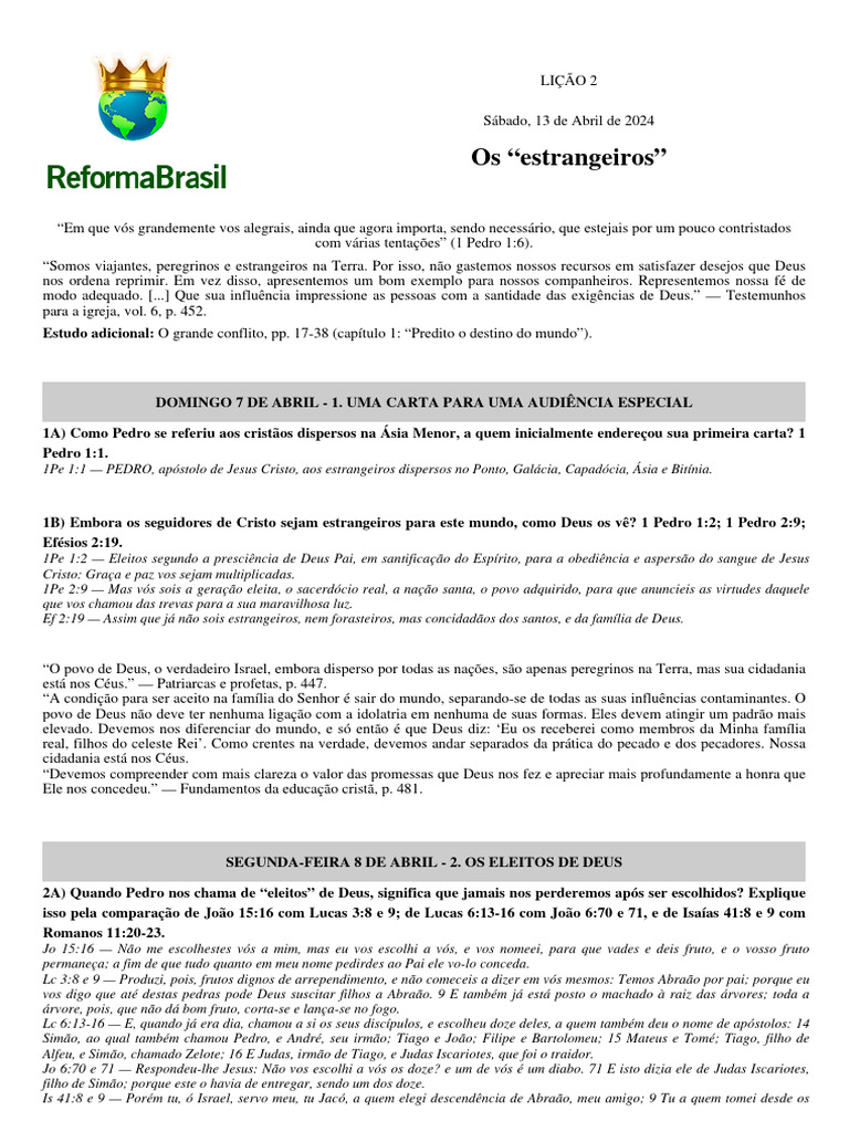 1Pe 2:9 — Mas vós sois a geração eleita, o sacerdócio real, a nação santa, o povo adquirido, para que anuncieis as virtudes daquele