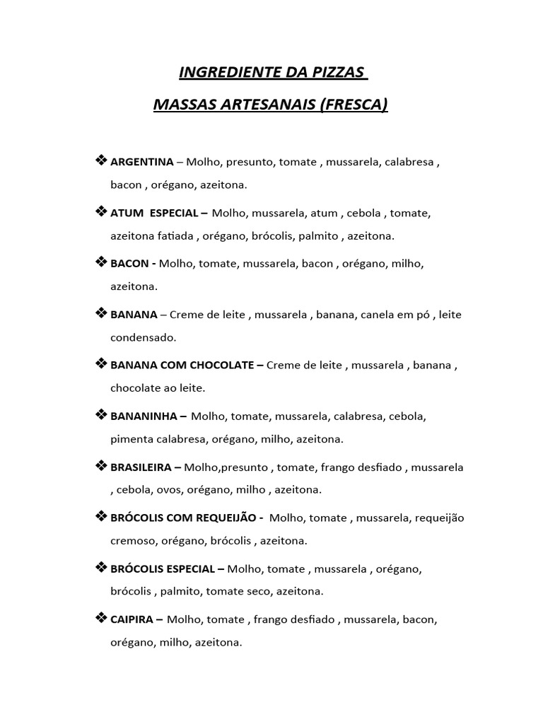 ❖ CAIPIRA – Molho, tomate , frango desfiado , mussarela, bacon,