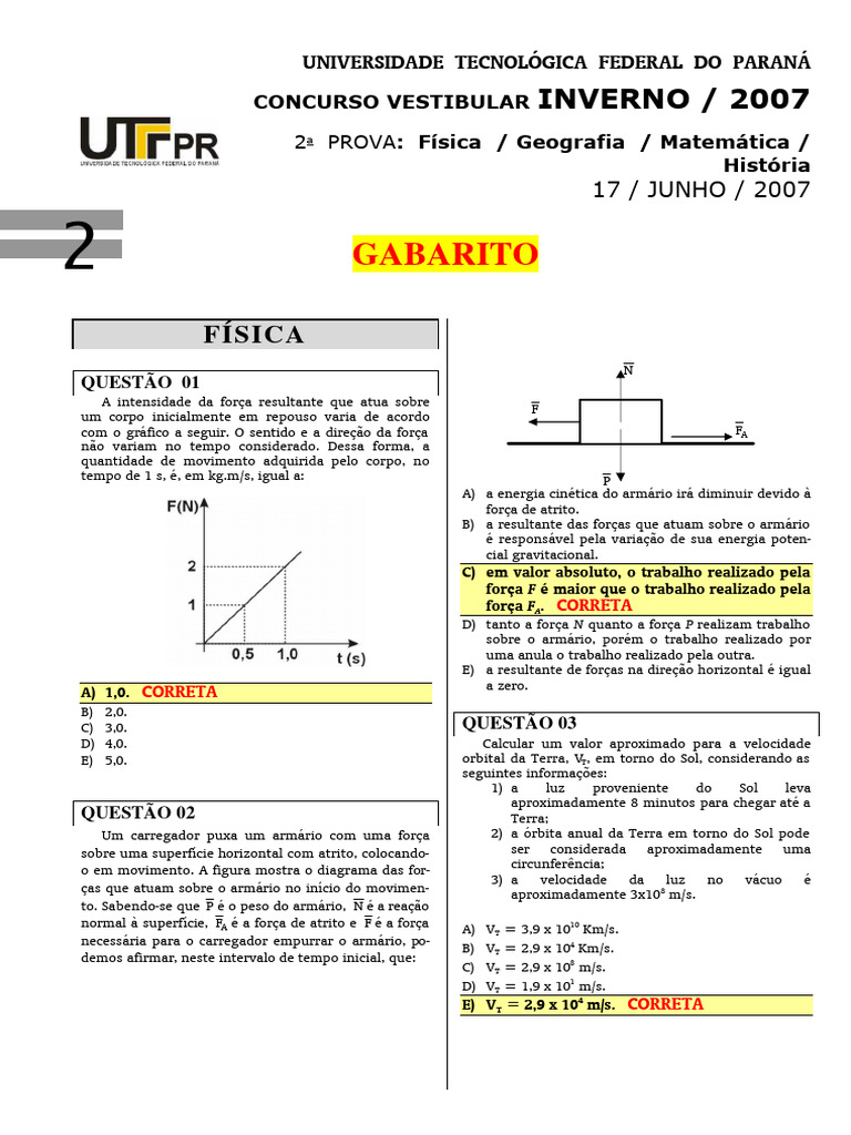 Gabarito da Prova de Física UTFPR 2007