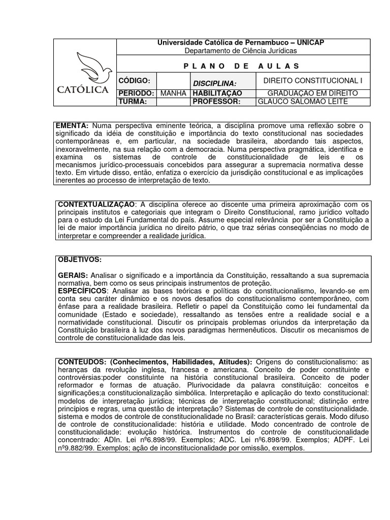 CÓDIGO: DISCIPLINA: DIREITO CONSTITUCIONAL I