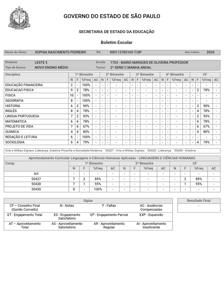 Nome do Aluno: SOPHIA NASCIMENTO PEDREIRO RA: 000113785169-7/SP Ano Letivo: 2024