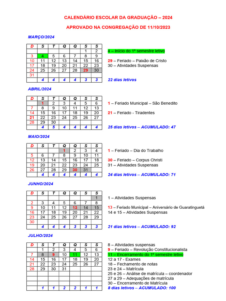 CALENDÁRIO ESCOLAR DA GRADUAÇÃO – 2024